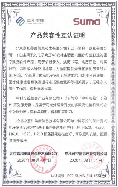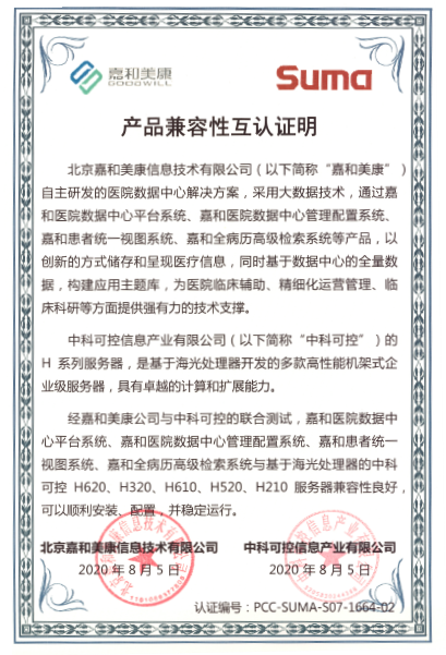 近日,嘉和美康與中科可控信息產(chǎn)業(yè)有限公司完成了部分核心產(chǎn)品的產(chǎn)品兼容性認證測試。根據(jù)測試結(jié)果,嘉和美康自主研發(fā)的醫(yī)院數(shù)據(jù)中心解決方案、電子病歷V6軟件與基于海光處理器的中科可控H620、H320、H610、H520、H210服務(wù)器兼容性良好,可以順利安裝、配置,并穩(wěn)定運行。