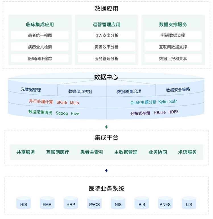 嘉和美康為用戶提供基于數據中心的互聯互通建設方案,通過企業服務總線和大數據技術,整合醫院現有信息資源,實現醫療數據交換、存儲和治理,建立電子病歷共享文檔庫,并構建全院實時全量數據中心,在實現院內信息互聯互通的同時,也為醫院提供統一的對外數據服務窗口,支撐大數據和互聯網應用。在此基礎上,為醫院提供一系列智能應用,提升臨床、精細化管理等方面的數字化決策水平。
