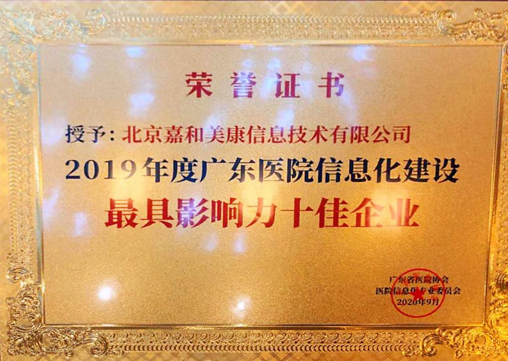 會上,嘉和美康因2019年在醫療行業所做出的卓越貢獻,獲得了由廣東省醫院協會頒發的“2019年度廣東醫院信息化建設最具影響力十佳企業”榮譽稱號。
